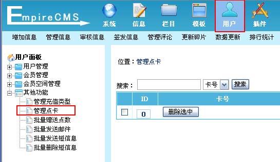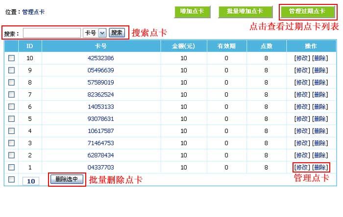 1、登录后台,单击“用户”菜单,选择“管理点卡”子菜单,进入管理点卡界面: