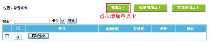 2、进入管理点卡界面,点击“增加点卡”按钮进入增加点卡界面:
