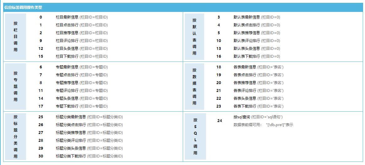 总结:栏目调用对应栏目调用的操作类型;专题调用对应专题调用的操作类型;按表调用对应按表调用的操作类型;按SQL调用对应按SQL调用的操作类型。