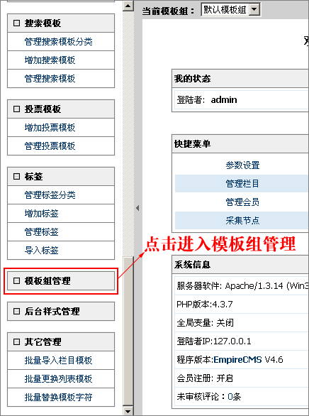 2、进入模板管理界面,拉到菜单最下面,点击“模板组管理”。如下图: