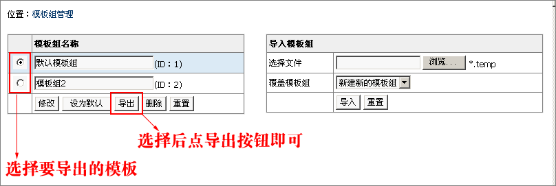 3、进入模板组管理界面,选择要导出的模板,然后点击导出按钮即可。如下图: