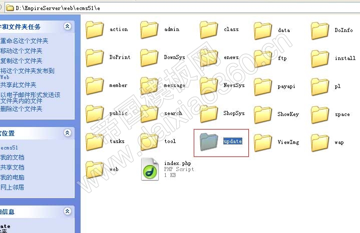 (1)、将万能会员接口包里的“update”目录上传至帝国CMS的“e”目录里(包含update目录本身)。