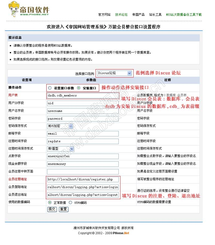Ucenter接口及Discuz通行证下载地址:http://www.phome.net/OpenSource/