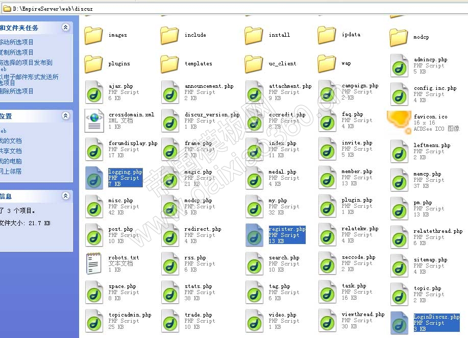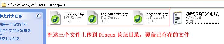 将通行证接口包里的“logging.php”、“LoginDiscuz.php”、“register.php”三个文件上传到Discuz目录: