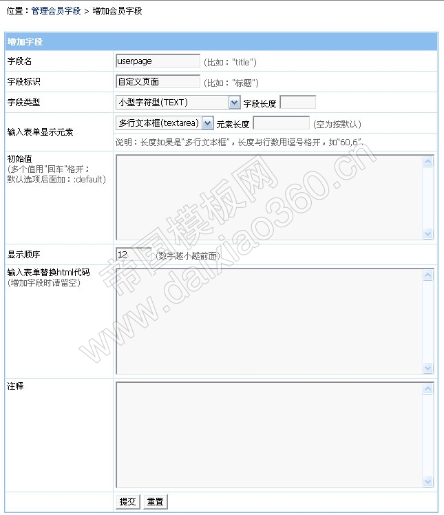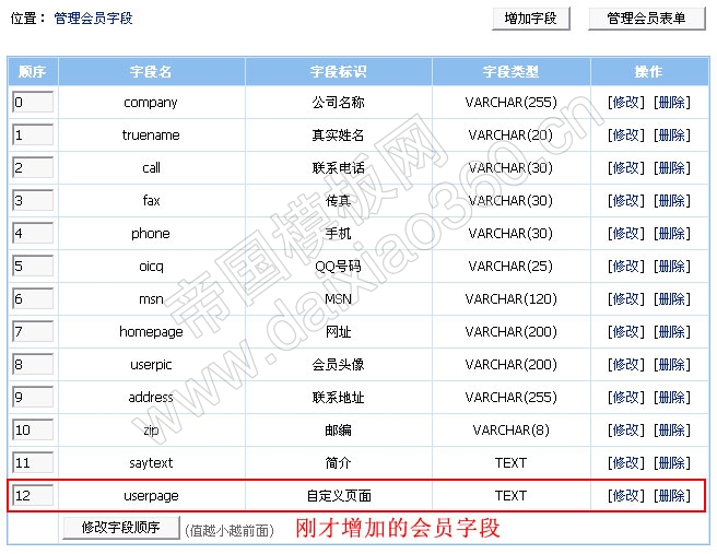 说明:上图增加的字段名为userpage的会员字段