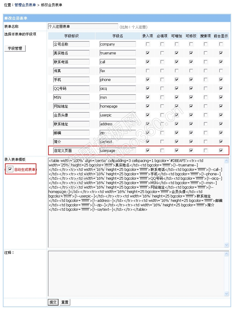 1、到“用户面板”->“管理会员表单”->修改“个人注册表单”,进入如下界面: