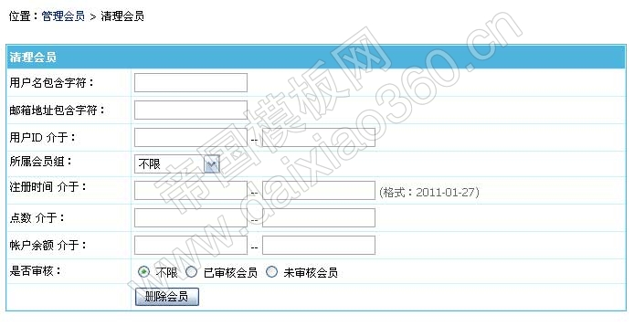 (1)、支持按用户名、邮箱查询删除 (2)、支持用户ID范围删除 (3)、支持按会员组删除 (4)、支持注册时间范围删除 (5)、支持点数范围删除 (6)、支持帐户余额范围删除 (7)、支持是否只删除审核或未审核会员 上传以下图片:
