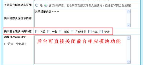 帝国CMS 6.6版新增关闭前台相关模块总开关,支持下载、电影、商城、在线支付、RSS、搜索模块关闭设置。关闭模块更方便,不需要删除相应文件。