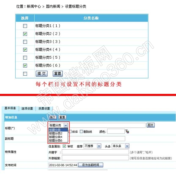 帝国CMS 6.6版各栏目支持设置不同的标题分类,更人性化。