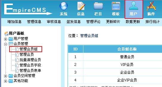 一、登录后台,单击“用户”菜单,选择“管理会员组”子菜单,进入管理会员组界面