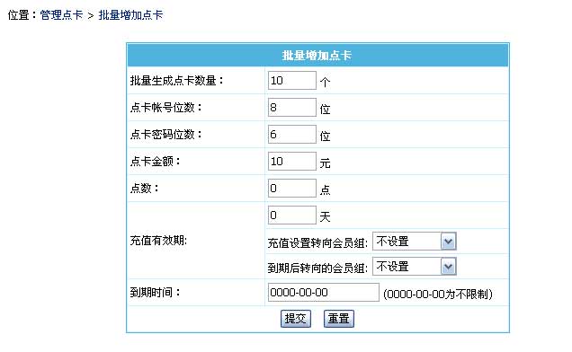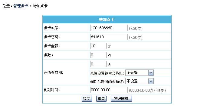 到期时间:设置点卡的过期时间(0000-00-00为不限制)。