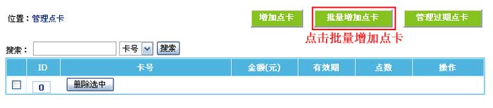 1、登录后台,单击“用户”菜单,选择“管理点卡”子菜单,进入管理点卡界面: