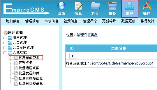 1、登录后台,单击“用户”菜单,选择“管理充值类型”子菜单,进入管理充值类型界面:
