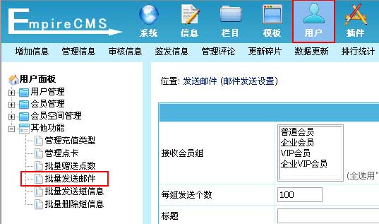 一、登录后台,单击“用户”菜单,选择“批量发送邮件”子菜单,进入批量发送邮件界面