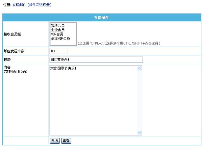 接收会员组:选择接收邮件的会员组(全选用"CTRL+A",选择多个用CTRL/SHIFT+点击选择)。