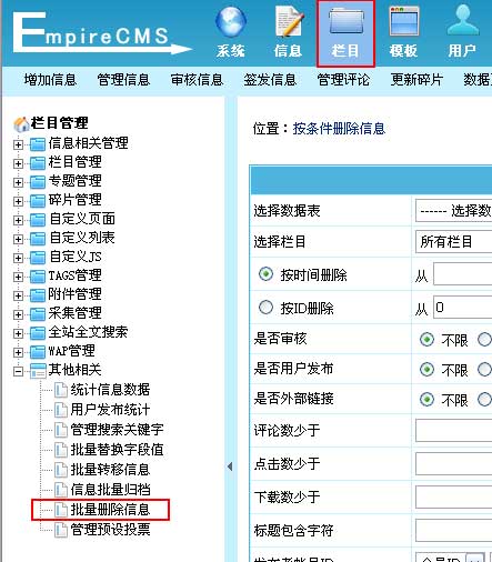 (一)、登录后台,单击“栏目”菜单,选择“批量删除信息”子菜单,进入批量删除信息界面: