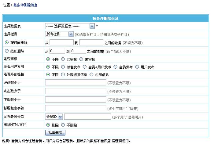 是否用户发布:选择是否只删除游客/会员/管理员发布的信息。