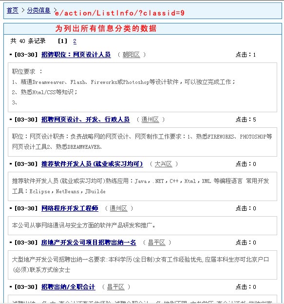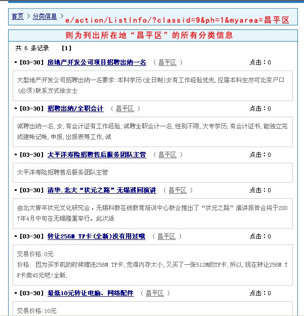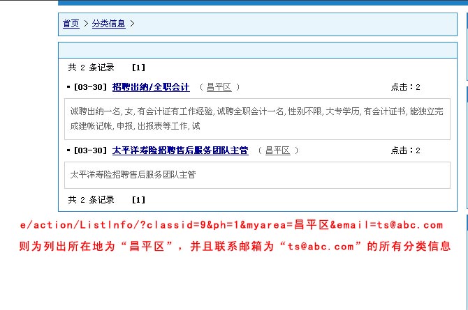 例1:显示分类信息表所有"朝阳区"地区的信息,地址为如下: /e/action/ListInfo.php?mid=8&tempid=8&ph=1&myarea=朝阳区