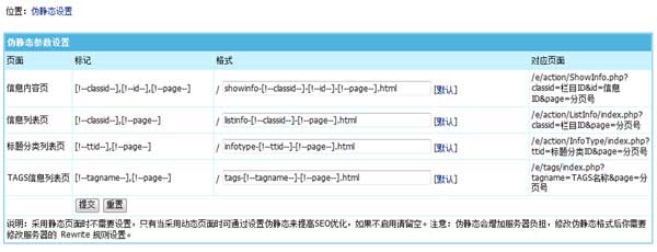 支持设置信息内容页、栏目页、标题分类页、TAGS列表页及各分页伪静态设置。