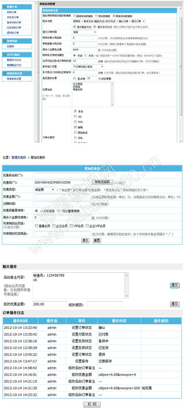 (6)、订单状态设置新增:订单状态(已确认/未确认/取消/退货)、发货状态(已发货/未发货/备货中)、付款状态(已付款/未付款)、库存(还原/减少库存)等操作。更强大。