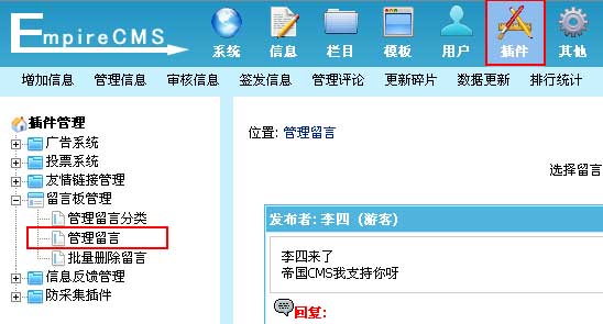1、登录后台,单击"插件"菜单,选择"管理留言"子菜单,进入管理留言界面: