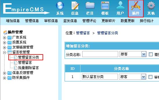 (一)、登录后台,单击"插件"菜单,选择"管理留言分类"子菜单,进入管理留言分类界面: