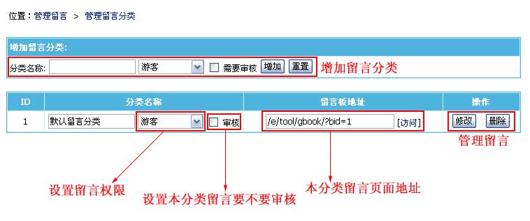 2. 修改留言分类:在已增加的留言分类中,修改分类名称、允许留言的最低会员组级别及留言是否需要审核,单击"修改"按钮。