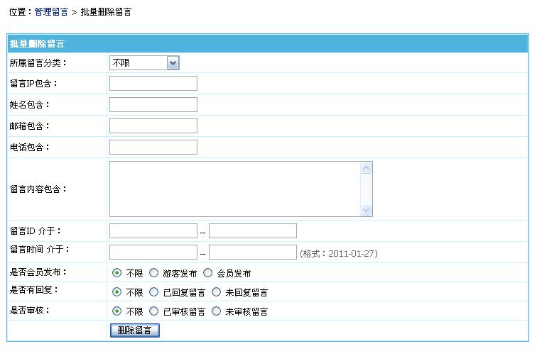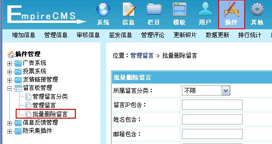 1、登录后台,单击"插件"菜单,选择"批量删除留言"子菜单,进入批量删除留言界面:
