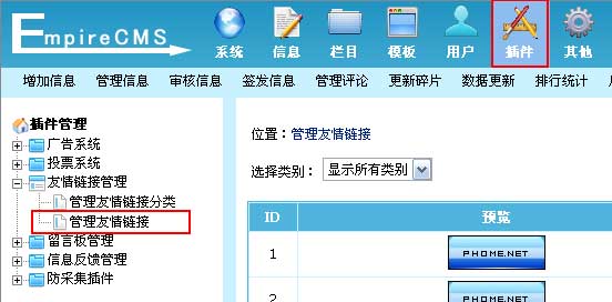 1、登录后台,单击"插件"菜单,选择"管理友情链接"子菜单,进入管理友情链接界面: