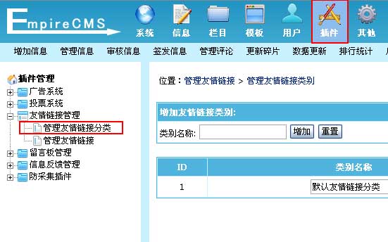 1、登录后台,单击"插件"菜单,选择"管理友情链接分类"子菜单,进入管理友情链接分类界面: