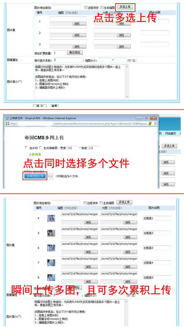 原来上传多图文件,需要挨个选择文件,然后再点批量上传,比较麻烦。所以帝国CMS7.2新增了多图上传插件:为采用FLASH方式实现同时选择多个图片一起上传,提高多图上传效率。