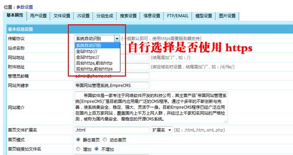 帝国CMS7.5版可自行灵活选择是否使用HTTPS: